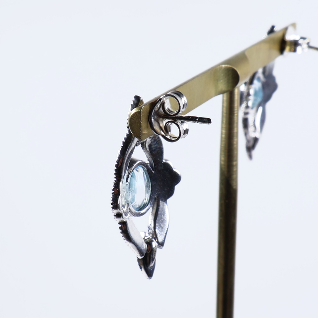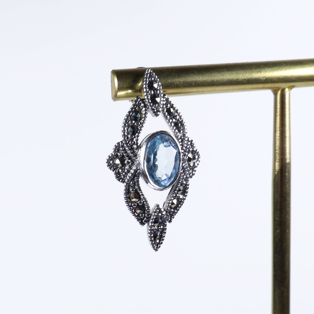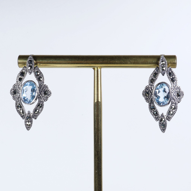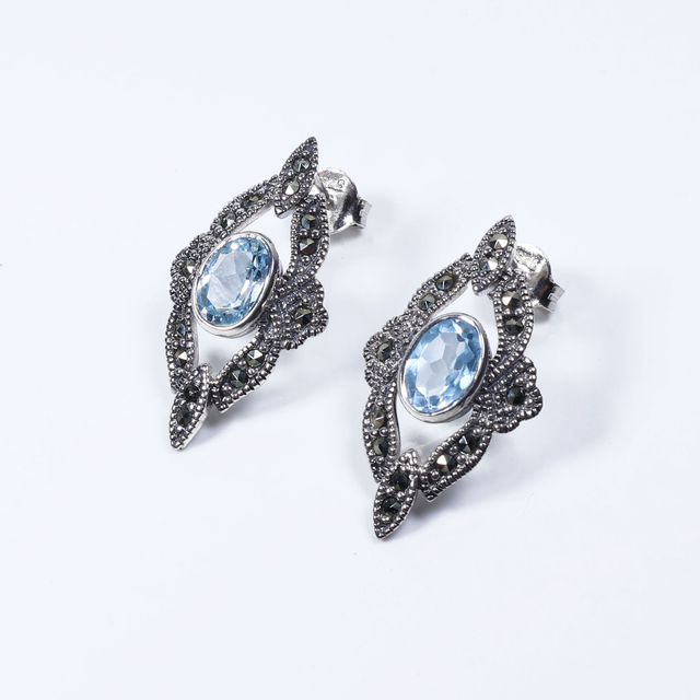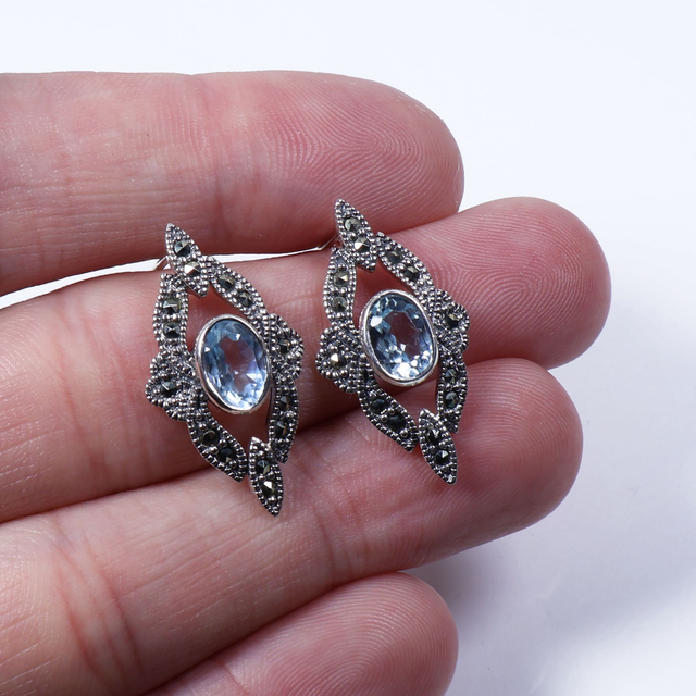 Art Deco Style Sterling Silver 925 Oval Cut 1ct Blue Topaz Marcasite Gemstone November Birthstone Diamond Shape Design Stud Earrings