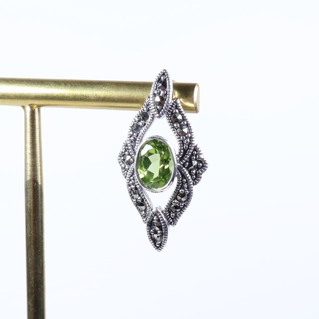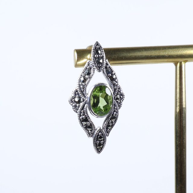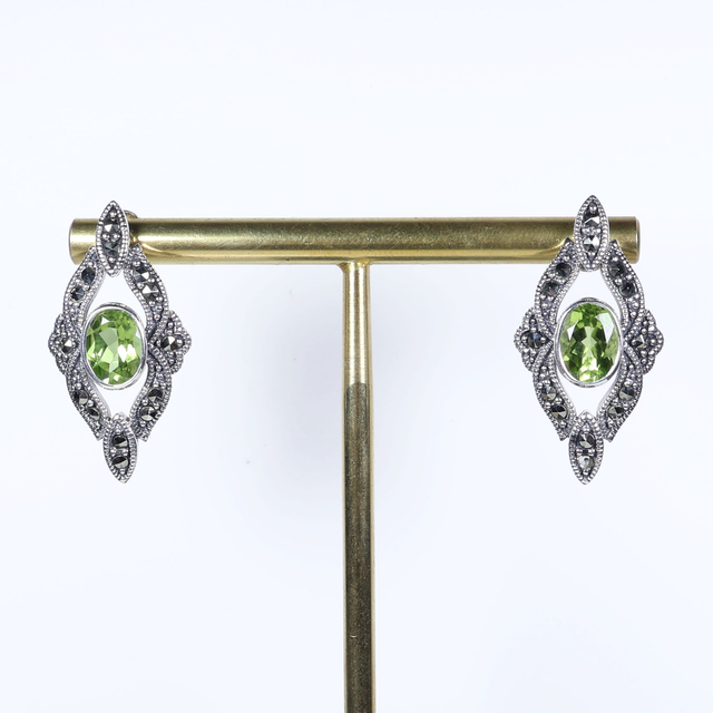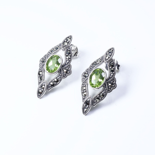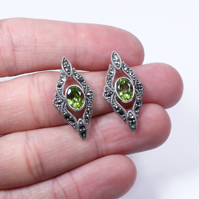 Art Deco Style Sterling Silver 925 Oval Cut 1ct Green Peridot Marcasite Gemstone August Birthstone Diamond Shape Design Stud Earrings