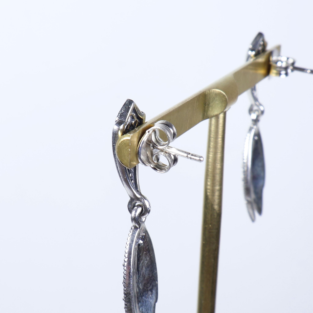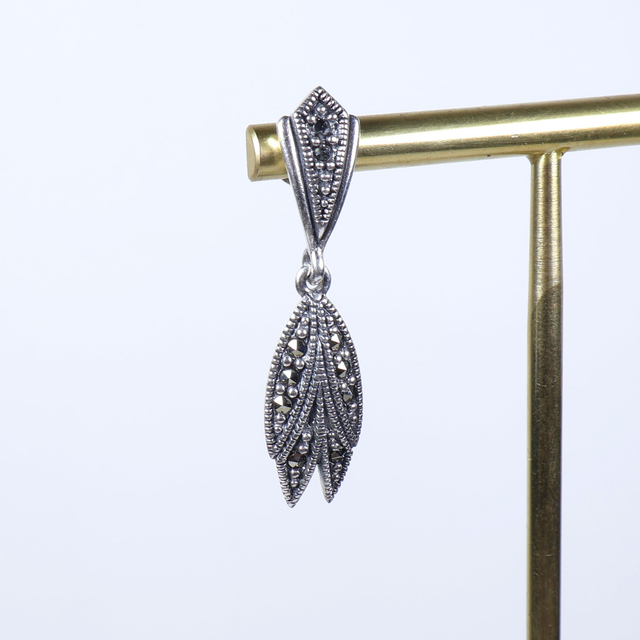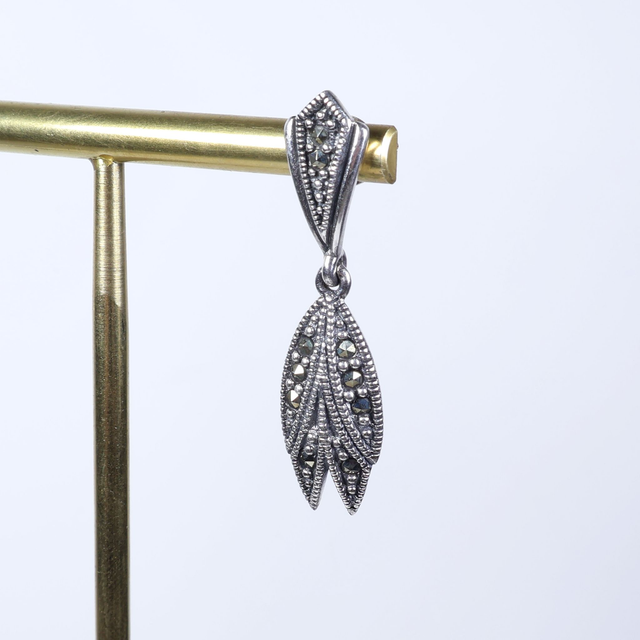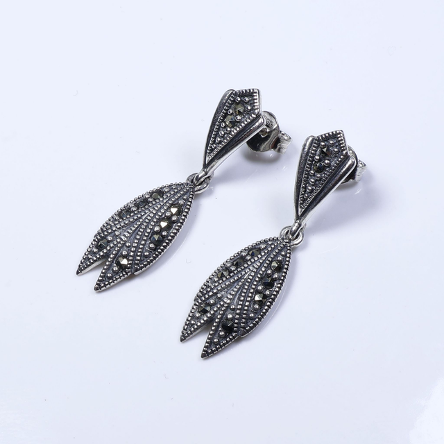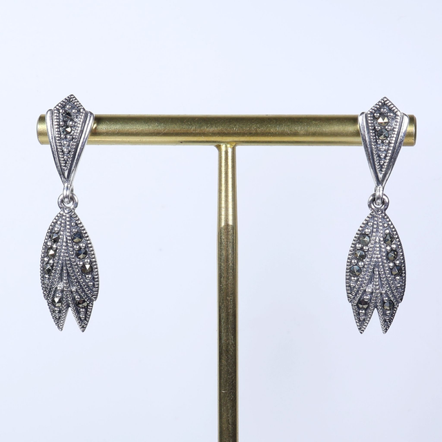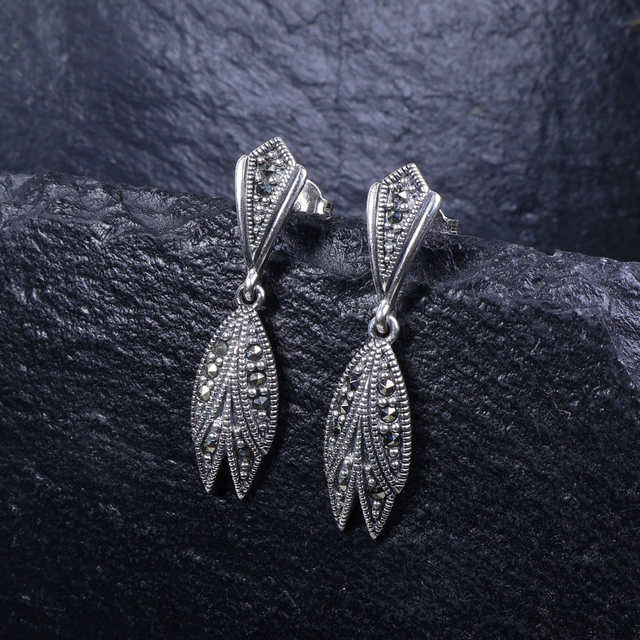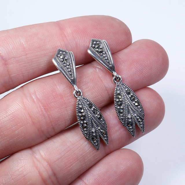 Elegant Pair of Sterling Silver 925 Art Deco Style Marcasite Gemstone Long Feather Wing Drop Dangle Earrings