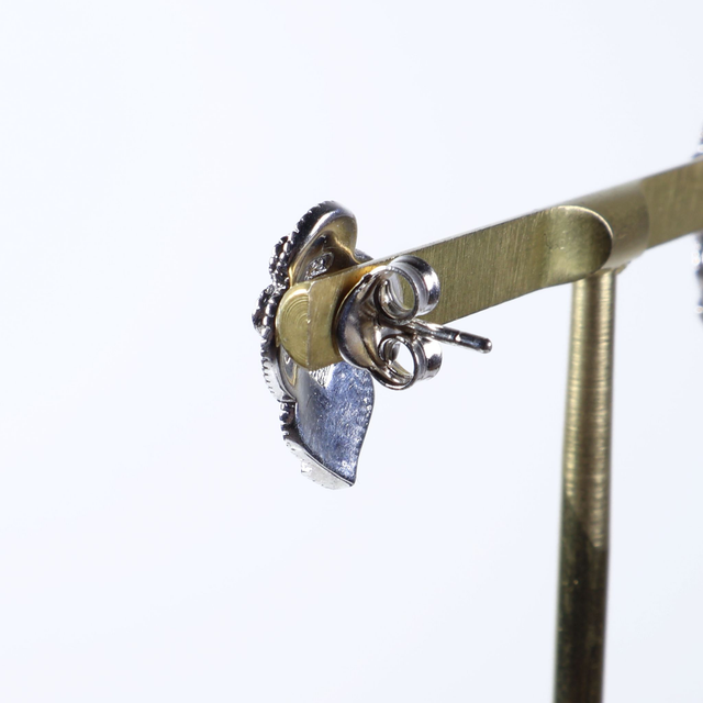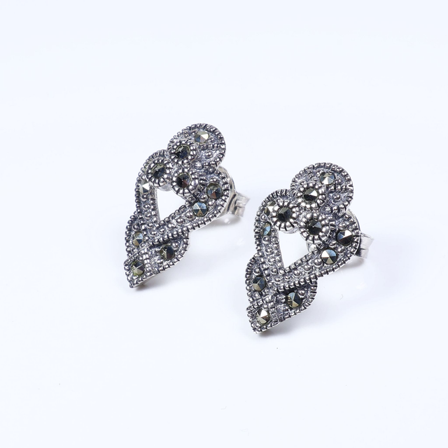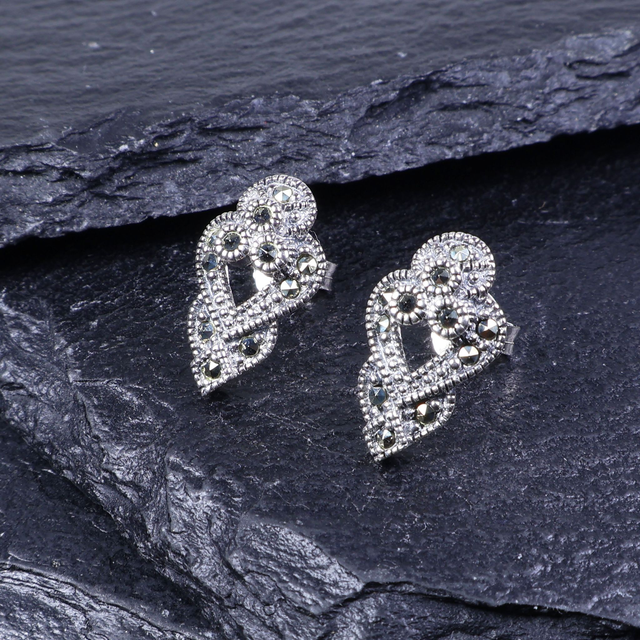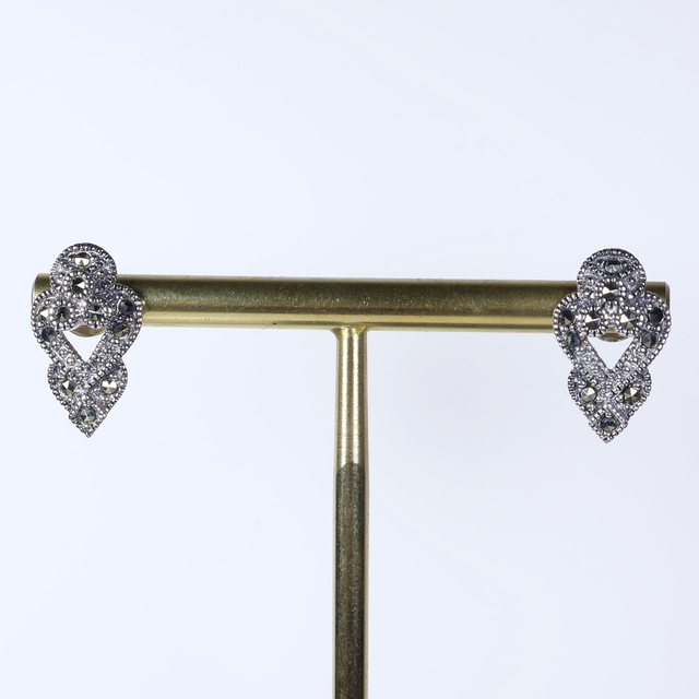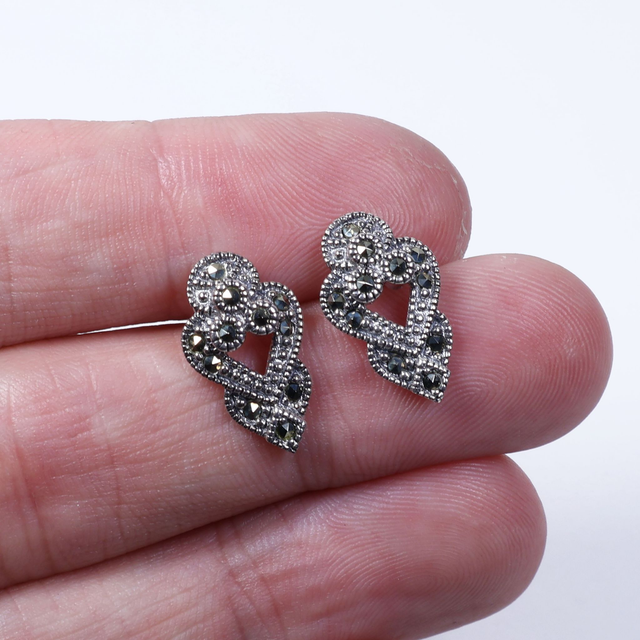 Elegant Vintage Sterling Silver 925 Art Deco Nouveau Style Small Arrow Marcasite Gemstone Heart Design Stud Earrings