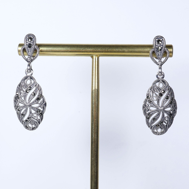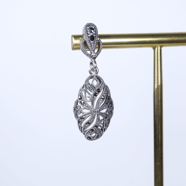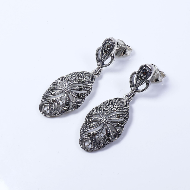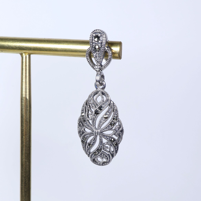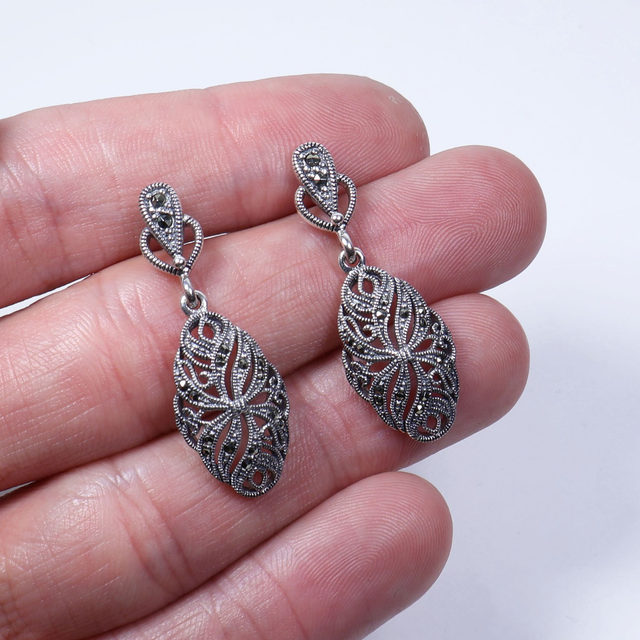 Pair of Elegant Sterling Silver 925 Art Deco Style Marcasite Gemstone Ornate Floral Oval Shield Design Drop Dangle Earrings