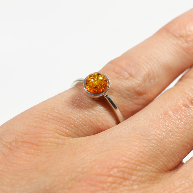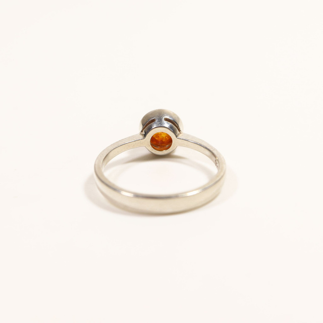 Sterling Silver 925 Minimalist Design Style Small Round Cabochon Cut Orange Baltic Amber Birthstone Gemstone Band Ring Size N - 6 1/2