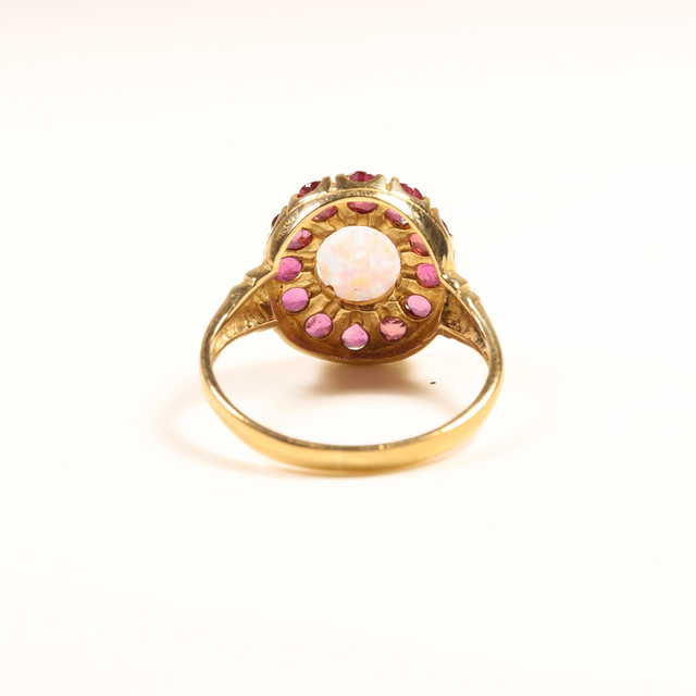 Gemstones: 12x (2.2mm) round cut dark pink rubies, 1x (7.8mm) oval cut man-made flashy opal cabochon.