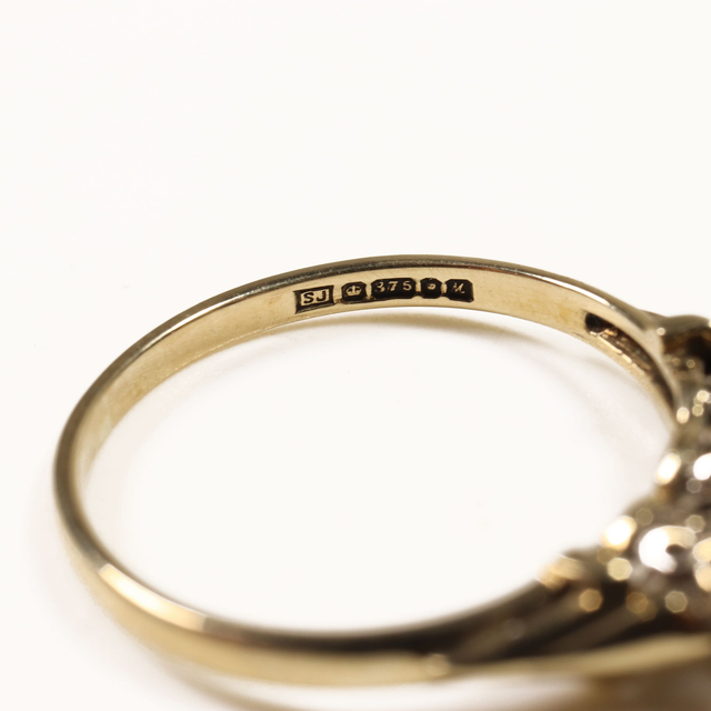 Hallmarks: SJ (makers mark), Crown 375 (Gold Mark), Leopard (London Assay Office Mark), Y (1986 Year Mark)