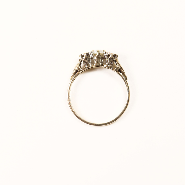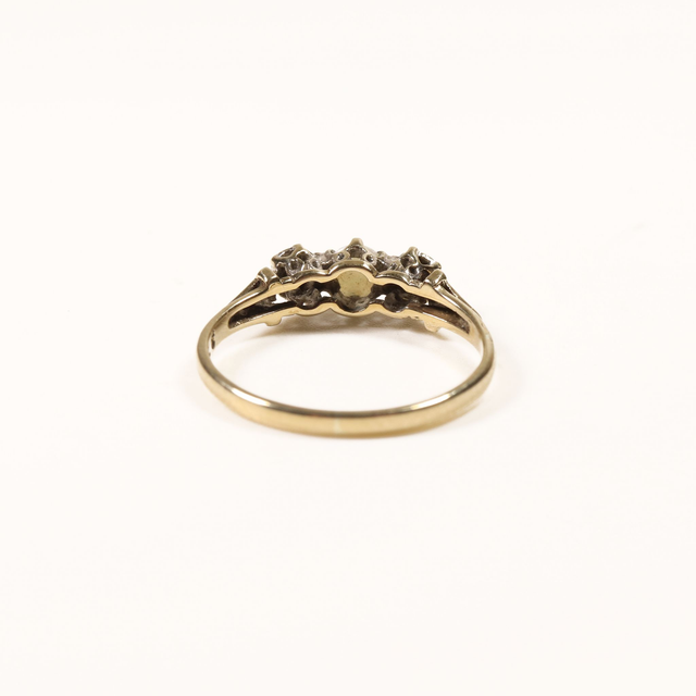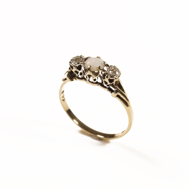 Vintage 9K 9Ct 375 Solid Yellow Gold Platinum Round Brilliant Diamonds Austrailan Opal Gemstone Set Trilogy Design Ring Size K 1/2 - 5 3/8