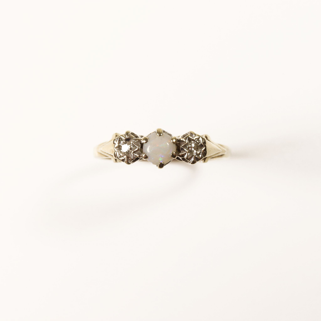Gemstones: 1x (3mm) round cut rainbow Australian Opal cabochon, 2x (1mm) round cut white diamonds.
