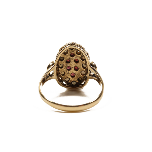 Vintage 9K 9Ct 375 Solid Yellow Gold Round Cut Red Garnet and Small Freshwater Pearl Natural Gemstone Ring Size N - 6 1/2