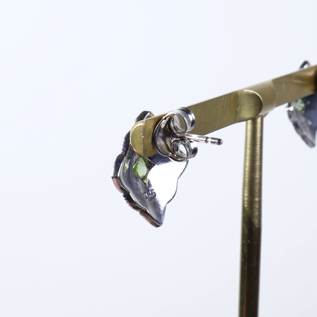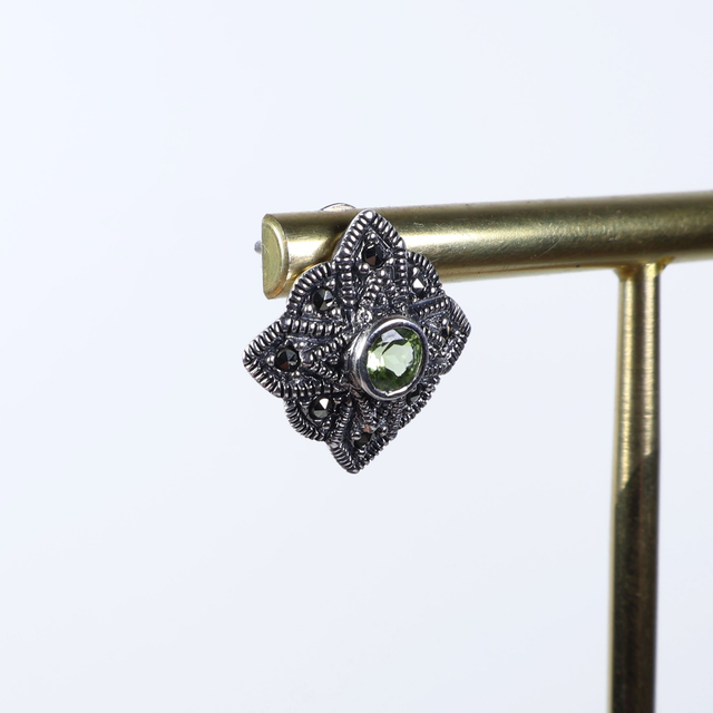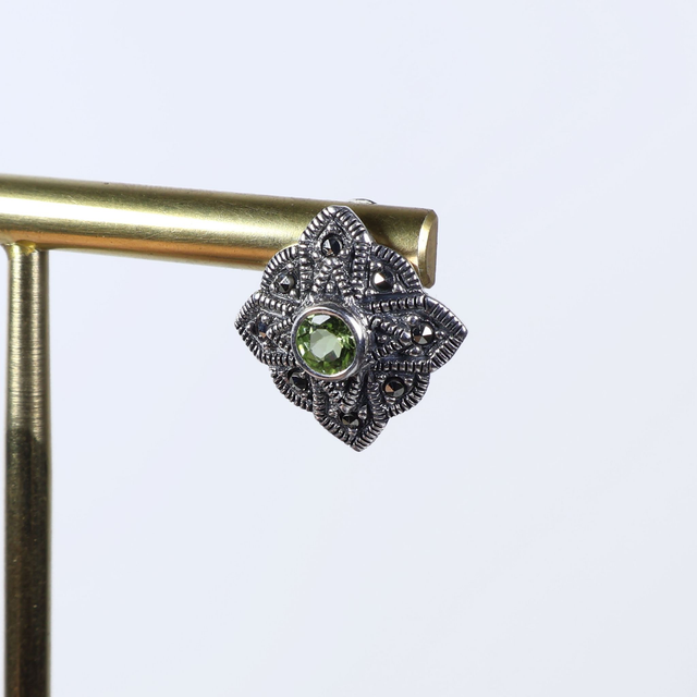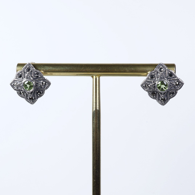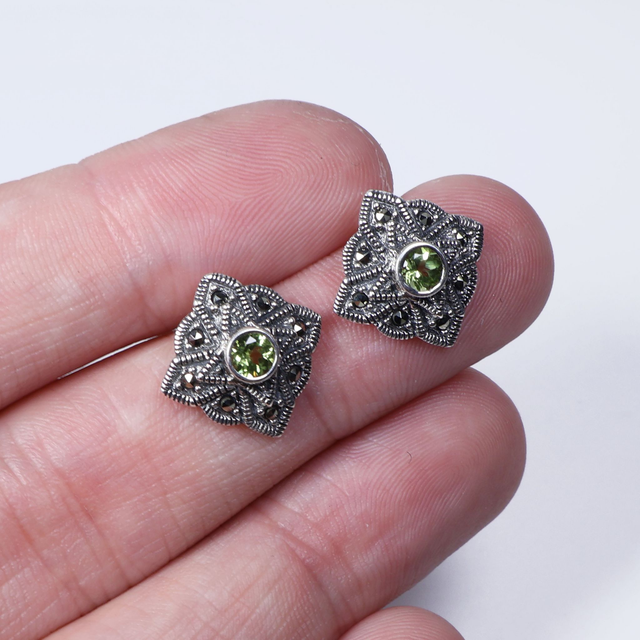 Vintage Sterling Silver 925 Art Deco Style Small Round Cut Green Peridot Marcasite Gemstone August Birthstone Star Design Stud Earrings